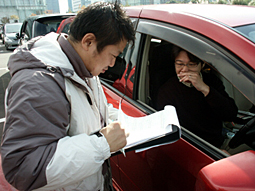 メインの写真撮影後に取材を受ける旅人さん。 アンケート用紙を元に各種質問を受けるので、 それに対して受け答えする方法で取材は進みます。 |