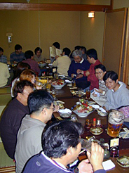 乾杯終わって直後の様子。まだまだ皆さん 正気の状態です。最初の一品目、 刺身の盛り合わせに舌鼓を打ちながら、 思い思いに談義中。 |