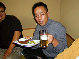 夜の部から参加のMajinbooさん。 ビール片手に昼の部に参加できず、 食いそびれた牛タンを手にご満悦。 またこの仙台オフがOB宣言発表の場と なりました。来年はE51で参加して下さいね。 |