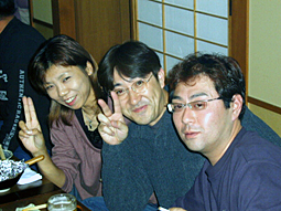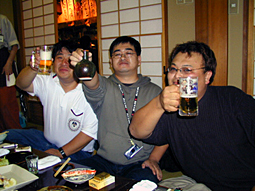 「ま〜、ま〜、ま〜、一杯やっつぁいQさん」 ピッチャー片手に皆さんにビールを注いで 回るこいちさん。顔をご存知ない方の為に、 左からこいちさん・プレ55さん・Q45さん。 |
