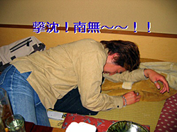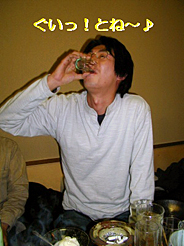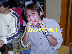 たらばカニ焼きにかぶりつく、のり@OBさん。 下山さんと同じく、結構顔が赤くなってます。 幹事が狂い水(日本酒)飲ませようとしたら、 却下されました(笑) ここから先の宴会シーンは、おやじんさんを 真似てちょっと写真に一言加えてみました。 |