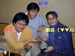 何か怪しげな取引をしている3人です。 怪しいのでこの3人の裏HNをお教えしましょう。 左よりおやじんさん=酋長。 こいちさん=総帥。Q45さん=組長(爆) |