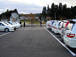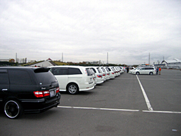 クレームにより急遽場所を移して仙台港です。 ちょっと離れた所で海外向けの車の積み込み 作業が行われていました。これだけ台数が 揃うと、まるで船積みを待つ車みたいです(笑) |