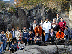 厳美渓をバックに記念撮影。 観光旅行も年々参加人数が増えてきました。 |