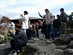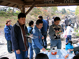 団子が籠に入れられてこちらにくるのを 撮影するメンバー。2年前と異なるのは 携帯で写真を撮っている人が多いこと。 こんなところで年月の違いを感じます。 |