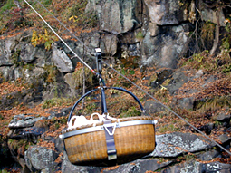 このように対岸と結ばれた1本の ワイヤーを使い、団子が籠に入れられて こちらに送られてきます。1パック¥300ですが、 メンバーで一斉にお金を入れたので、 ○千円になり、対岸の団子屋の親父が 双眼鏡で人数を見て数を確認してました^^;。 |