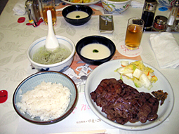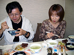 牛タンをパクつくお二人はプレ55さんと NORIKOさん。麦飯はお代わり自由で、 3杯お代わりしたツワモノもいました。 |