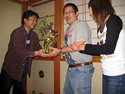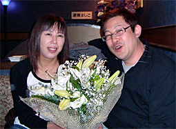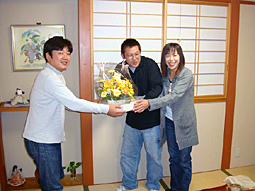 花束を受け取って嬉しそうなお二人さんです 花のアレンジは坊幹事のセンスとか(笑) |