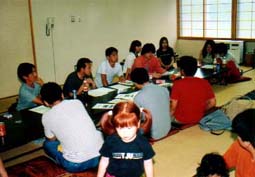 雨のため,室内でのプレ談議。 奥方の視線が気になりました。 |