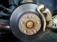 取付けられたブレーキ本体の完成図です。 この姿になるまでが大変で、まずローターが厚くて オフセットが変わってしまい、ハブボルトを5mmほど延長。 一番困難だったのがキャリパーで、キットのブラケットでは ボルトの径が違う・穴の位置が違う・厚さが足りない等で 付けられず、社長がブレーキを前に2時間以上悩んでました。 最後にこれでダメならブラケットを作るということで、 ダメ元で社長が考え出した案が大成功!! 社長が自ら久々に悩んだというブレーキの完成です。 |