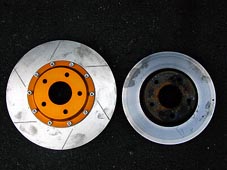 ローターを並べて比較してみました。 こうやって並べてみると、その径の違いがよくわかります。 大きいアウトロー製ローターの方が重そうに見えますが、 中央部のベルハットに軽量なジュラルミンを使っている為、 ほとんど重さに違いはありません。ローターが磨耗した際は ベルハットの部分から取り外して交換します。 純正はローター本体と一体で丸ごと交換式でした。 ベルハット部も鋳鉄なので見た目以上の重さがあります。 |