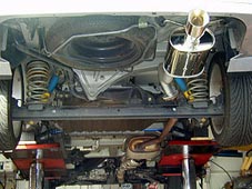 こちら横方向から全体を捉えたもの。 リアシャーシのリジットを避ける曲げがある以外は 横方向も真っ直ぐに作られています。 縦方向と合わせ、かなり理想的な取り回しと言えます。 |