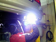 取付け掛台を本溶接中の社長。 取付けた状態で最後の接合部溶接を行なうことにより、 走行中の振動に溶接部が外れないようにします。 |