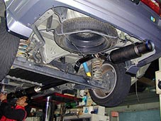 真下から撮影したキャタライザー〜サブタイコ〜 センターパイプ〜テールエンド。縦方向に対しては 曲げがほとんどなく、ほぼ真っ直ぐなのがわかります。 |