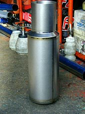 取付け用の掛台(もちろんチタン製!)の仮溶接も終わって あとは取付け待ち状態のテールエンド。 形状も砲弾型で迫力十分です。 この後、出口付近をあのチタンの怪しげな焼き色に仕上げて もらいました。 |