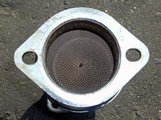 スポーツキャタの内部です。この網の目のような部分の 隙間から排気が通る際に、排気に含まれる有害物質を 化学反応で無害なものに変化させています。 純正との違いはこの網の目の細かさ。スポーツキャタは かなりゆとりをもった作りですが、純正はセラミック製で割 れやすい為、強度を確保すべく目が必要以上に細かい ので、この差が抜けに大きく影響してきます。 |