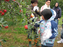 大量にリンゴを狩っているのはプレサンジさん 4〜5個で250円位のはずなのでいったい・・・ この後ブドウも狩っていました (まんちゃんプレさん提供) |