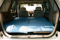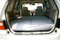 装着しての使用した感想ですけども、車内泊はもちろんのこと 昼寝にはもってこいのアイテムだと思いました。 広さは大人2人が十分(私、身長170cm)足を伸ばして寝られる 広さです。1人なら大の字になることも可能だと思います。 「シート座面と背面との段差が若干生じるため完全にフルフラットな 状態になりません」とは、メーカの弁ですが、気になるとすれば シート形状により大きく波をうっている所ぐらいです。 寝た感想はキルティング加工のカバーが肌ざわりがよく、 ごつごつ感もあまりなく気持ちよく寝れました(笑) 友達も「これごっついええベッドやなぁ」と話しており、女の子達も 「これ、気持ちいぃ」と言って大好評でした(笑) 自分もですけど回りがこんなにいいと言ってくれるので これはありかなと思いました。 最後に走行中はこの状態では、危険ですのでしないでくださいと、 説明書に書いてあったことだけ伝えておきます。 あと、1999年10月現在のカタログでは2分割のものですが サードシートのみのフルフラットカバーも出ています。(防水タイプ) |