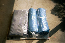 内容はねずみ色の方が外側のカバーです。 青色のロール状のもの2本が下側のマットです。 |