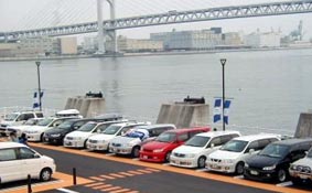 大漁旗を掲げての集合記念撮影 (撮影かずりんさんの奥様) うまいこと固まって駐車することが出来ました。 |