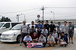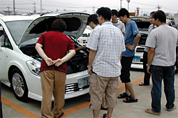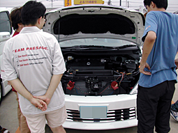 ボンネットを開けて談義。 TEAM PRESAGEシャツを着ている方は ディーラーの方ではありません。(笑) |