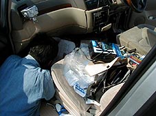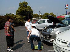 カモドゥーにて エスクのボンネットを開け「さぁ〜てやろうか!」とあきらさん 道具持ち出し何をやるのかなぁ? |