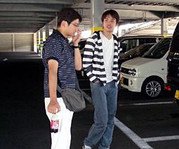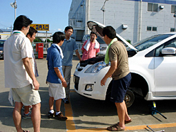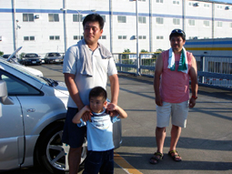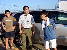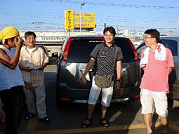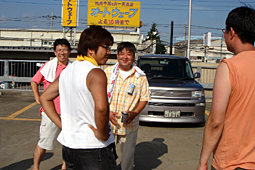 1Fの涼しいところで本日の作業を終えたチュンバ号を 前に談議中のこいちさんとチュンバさん。 |