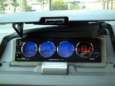 ・audio-technicaパワーモニター;センターコンソールアッパーボックス 内へリッドと連動して格納出来る様リンク自作 (左からアンプテンプメーター(3箇所のサーモセンサーによりそれぞれ 冷却FANオン・オフコントロール可)、音圧レベルメーター左・右、バッ テリーボルテージメーター) |