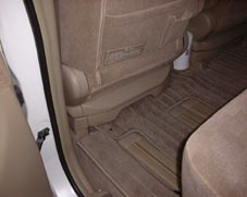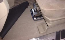 助手席ドア側から見たDVDナビ本体設置位置 (マットを捲くったところ)。 助手席スライド位置は私が通常運転する運転席 のスライド位置に合わせています。 |