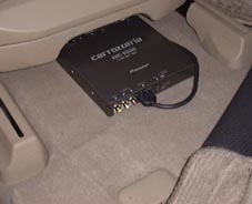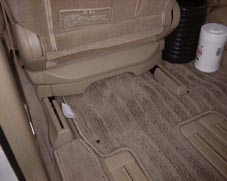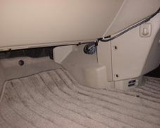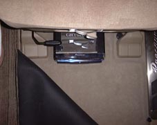 DVDナビのTVチューナーの設置場所 (マットを捲ったところ)。 助手席の真下にこのように設置しました。 助手席のスライド位置は前一杯にしています。 |