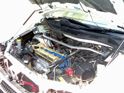 あんまり空けないエンジンルーム。 バッテリーの上にある四角い物がホットイナズマ。 (話によると11000がどうとか。。) |