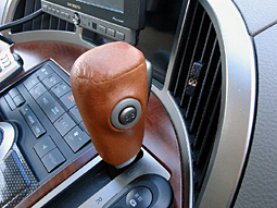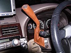 自作本革巻きシフトノブ&ブーツです。 何回かのバージョンアップを重ね、今回はシフトノブ〜ブー ツまでを一枚革で作ってみました。 手触りもよく、ちょうどいい太さで握りやすくなかなか気に入っ ています。 (社外品も付けてみましたが、ODスイッチが押しにくくて個人 的には不可でした) |