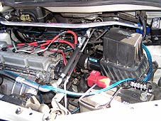 タワーバー&自作アーシングです。 ノロジーホットワイヤーの赤ケーブルがうねうねしています。 |