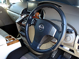 ステアリングはV35スカイライン GT350用 です。やはり3本スポークじゃないと(^o^) センターコンソールにはナビ本体とMDヘ ッドが入っており、カバーは撤去しています。 |