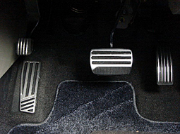 ペダルたち。ブレーキ:後期HS用。 フットレスト:TOYOTA ヴェロッサ用。 アクセル&パーキング:自作で加飾。これまたなんと ワイパーリフィルの背骨部分の流用です! 自分では気に入っているのですが(^^;) |