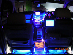 夜の室内。シート下や間接照明など にネオン管×4。 あとはフロントからサードシート周辺 までLEDでいっぱいです。 |