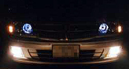 ふじいさんの”ハイビームポジション化”(小技&裏技)を 参考にさせていただきました。私の場合、高輝度LE D白・青を各一ヶづづ組み合わせてフォグランプの線 に結線しました。(ふじいさんありがとうございます) また伊藤さんの”簡易フラッシングユニット”閉の状態が こんな感じで点灯します。 |