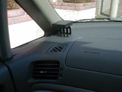 レーダー探知機は、独自加工で助手席上部に設置。 シガライター端子から電源をとっているが、配線はダッ シュパネルの中を通し、線がブラブラしないようこだわ った。 |