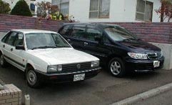 プレは、主に家内・家族の使用。通勤用のサンタナは、 平成元年式。中古で買ったが車体購入金より修理費が かさんでいる。が、・・・だめな子ほどかわいいもので、手 放す気持ちになれない。プレと並べるとちょっと貧弱に 見えてきたな。 |