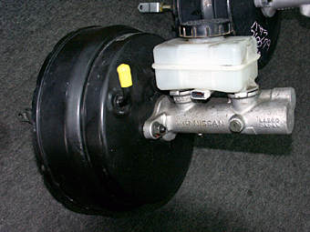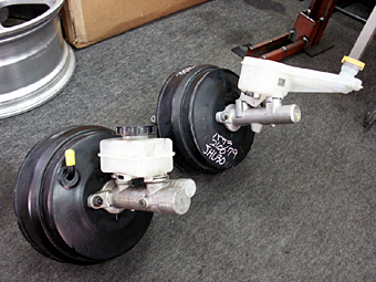 同じく比較用&最終的にシリンダーの部品取りとして入手したGT−Rの マスターバックとシリンダー。見ての通り、明らかにシリンダーの径が 違いますが、GT−Rのように最初から4POTの大きいキャリパーが 入っている車は最初からこの大きいサイズのシリンダーが使われています。 径はいわゆる片持ちの標準キャリパー仕様に使われるサイズが25.4φ。 大型のキャリパー搭載車に使われるサイズが26.9φで、一回り大きい 径になります。 |