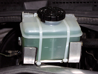 こちらが完成したリザーバタンクの取り付け状態。 空間的余裕から取付用のヒンジがあるとボンネットに当たってしまう ことが判ったため、ヒンジを使った取付けをあきらめて邪魔になる ヒンジをカット。マスターシリンダーの根元と一体になった取付け ステーを作ってその上にタンクを載せた形となりました。 このタンクが取り付けられた部分。丁度純正タンクの注ぎ口がくる 場所の為、ボンネットに干渉しないよう、切り欠きが設けられており、 空間的余裕があった為、そこにタンクをセットしました。 若干、タンクが前傾していますが、水平に取り付けるとボンネットと 干渉する可能性が高い為、逃がすためにわずかに前に傾けてあります。 |