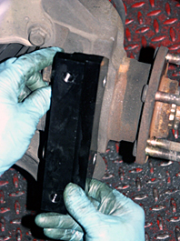 Outlowキャリパー取外し 物理的に収まることが判明したため、 いよいよ本取り付けを行うべく、Outlowの キャリパーを取り外しています。 当然ですがブレーキフルードを抜かなければ なりませんので、抜き取り作業を行っています。 |