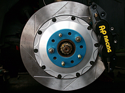 3年前、車のパワーアップを見据えて導入した <Outlow社>のS15用強化ブレーキシステムも、数万キロ走行により ローターが磨り減ってスリットが完全に消えてしまい、ローター自体にも 寿命がきました。 また、キャリパーが強化品としてはかなり小さめであり、プレの車重を支 えるにはやや力不足で、ハード走行による酷使もあって開き気味になっ てきていました。 ローター交換&キャリパーをオーバーホールして使うか?それとも?? という選択をしなければならなくなった中、更に先のステップを考えて 導き出された答えは、思い切って本物のレーシングブレーキに交換し ようと言うものでした。 2セット目の強化ブレーキとしてチョイスしたのは、alcon(アルコン)とな らぶブレーキの名門<AP>。 ブレーキの制動能力はポット数よりローター径とパッドの大きさによって 左右される部分が大きい為、4ポットでも十分過ぎる性能を得られます が4ポットの場合、ブレーキング時のコントロール性が多少荒くなり、強 力故にドッカンブレーキとなってしまう為、コントロール制に優れる6ポッ トを。ローターは17インチのホイールでは限界一杯の355φ(14インチ) を採用しました。 以下の写真はOutlowブレーキキットとの比較や、実際にAPのキットが 取付けられるまでの様子を撮影したものです。 純正はOutlowを導入した際に廃棄してしまった為、3種類並べて比較 に持ち出せなかったのがちょっと残念です。 |