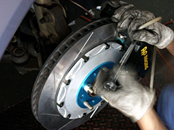 エア抜き作業 キットの取り付けが完了し、ブレーキフルードを 入れなおして、フルードのエア抜き作業を行って いるところです。ここが中途半端だとブレーキの 効きが甘くなったり最悪、効かなくなるという ことがあるので、大事な作業です。 |