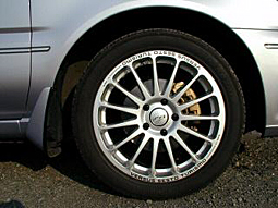 キャリパー&ローター キャリパーとローターを一緒に置いてみました。 キャリパーは長さが何と280oもあります。 (参考:Outlowは230o) この大きさは純正のローター径とほぼ同じ大きさですが、 重さはこんな巨大なのにも関わらずアルミ鍛造製なので、 何と3kgしかありません。これは純正キャリパーの半分、 Outlowより700g重たいだけです。 ローターはインチ換算すると14インチという巨大さで、 8kgの重量がありますが、ベルハウジング部が非常に 軽量の為、純正より1kg弱しか変わりはありません。 バネ下に装着されるパーツだけにこの軽さが大きく モノを言います。 |
