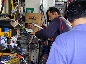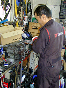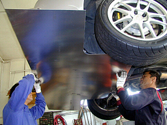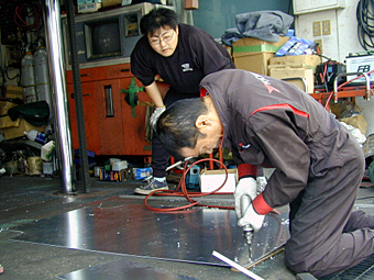 9.フロント作成作業 架台の位置が決まったので、プレートを型取りして、 取り付ける穴の位置などを決めています。 まだこの状態は様子見の段階で、この後7〜8回、 このように仮止めをしては外してを繰り返し、 型合わせを行って作成していきます。 |