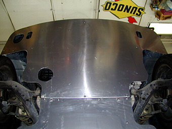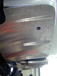 14.3枚目位置取り ほぼ燃料タンクのある部分を覆う形になる3枚目の 位置取り作業風景です。左側が斜めにカットされて いるのは、ここにリアブレーキのラインが通っており、 干渉しないようにするために施された処置です。 奥に2枚目が装着された状態で写っていますが、 大きなサービスホールはMyプレの床下に移設した バッテリーの装着箇所です。 (この後、脱着可能なプレートで穴を塞ぎます) |