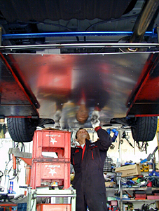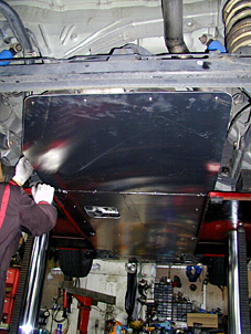 13.2枚目位置取り 最も大きなプレートを使うことになった2枚目の 位置取り作業風景です。この部分、プレートの長さが 長くなる為、左右のアングルで吊るすだけでは固定力が 不足することが判った為、縦にもアングルが入っています。 このような構造になった結果、ロアアームバーや タワーバーほどではないにしても、フロア下全体に 補強が入ったことになり、ヨレ易いフロア下のボディ 剛性強化にもなりました。 |