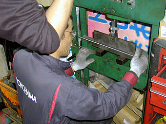 16.リア整流板作成〜その1 よくディフューザーのリアに見られる縦の整流板を 作成している所です。プレス機を使い整流板の形状を 整えていきます。 |