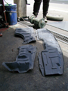 2.フロントアンダーカバー U30のフロントアンダーカバーです。 今回は前から後ろまでフロア全体を覆うことになるので、 純正のアンダーカバーは撤去、廃棄となりました。 また写真に収めていませんが、前後左右に計4箇所ついて いた泥除けも空気抵抗になってしまうため撤去。 装着して3ヶ月のグランドエフェクターも撤去しました。 |